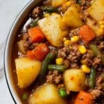- Combine Ingredients: In a large mixing bowl or casserole dish, combine the cooked ground beef mixture with the carrots, potatoes, corn, and green beans. Stir well to evenly distribute the ingredients.