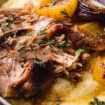 Carefully nestle the seared pork shoulder back into the pot, skin side up if it has skin. Arrange the peeled and wedged apples around the meat. Cover the pot with a tight-fitting lid, then transfer it into a preheated 325°F (160°C) oven. Braise the pork for about 3 to 3 ½ hours, or until it’s fork-tender and falling apart. I like to check at 3 hours to make sure it’s juicy and not drying out—if the liquid looks low, add a splash more apple cider or stock.