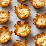 Top each bite with roughly 1 teaspoon of real bacon pieces. Then bake the filled shells on your sheet for 5–8 minutes until warm and slightly bubbly. Don’t leave them too long or the fillo can burn — keep an eye on them and pull them once they’re nicely warm and the cheese looks melty.