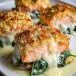 5. Assemble in Baking Dish: Grease a baking dish and place the seared salmon fillets skin-side down. Spread the creamy spinach mixture evenly over the top of the salmon. Sprinkle shredded mozzarella cheese generously over the spinach layer.