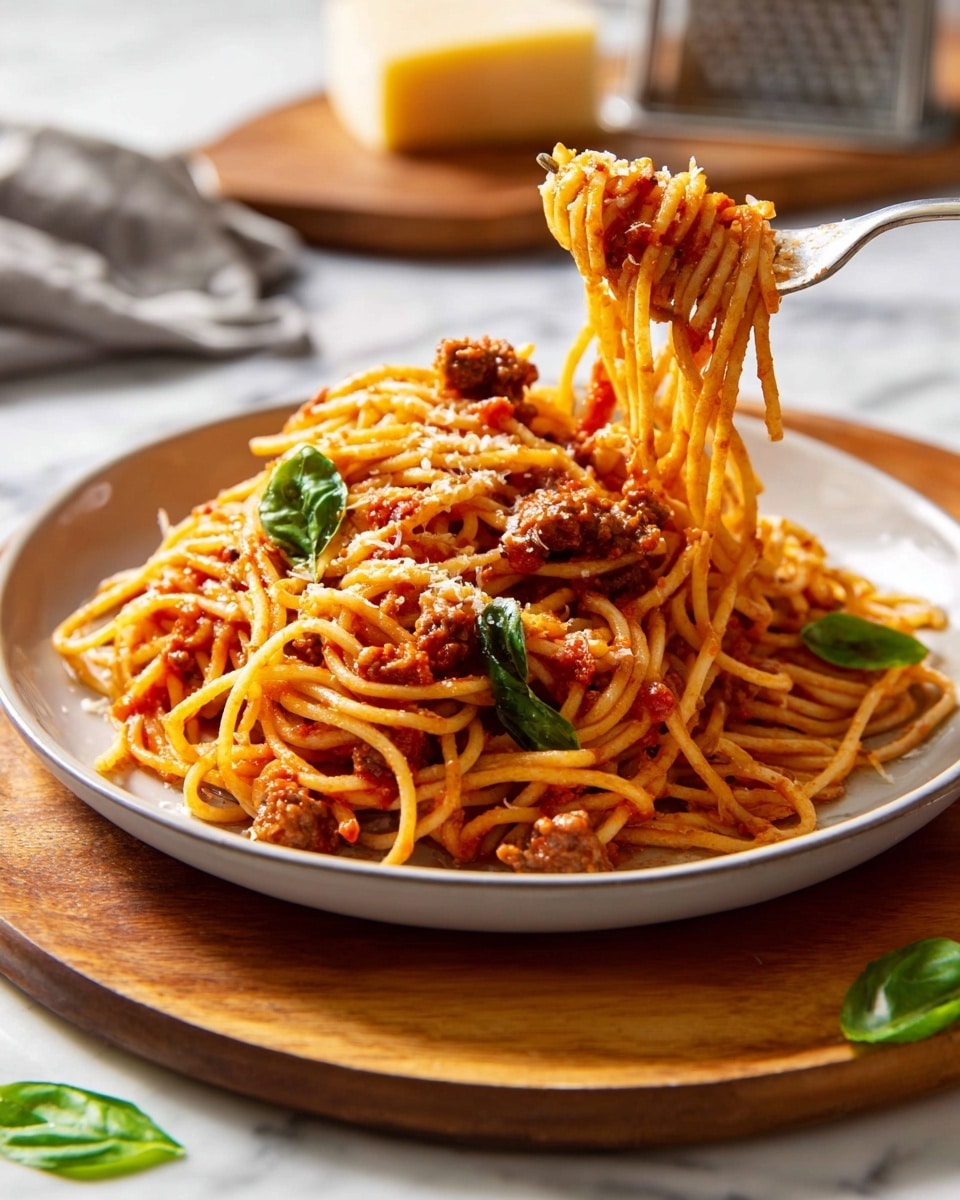 Preheat your oven to 350°F (175°C). In a large baking dish, mix the cooked spaghetti with the sauce and meat mixture until it’s evenly coated. Sprinkle the shredded mozzarella and the remaining Parmesan cheese on top, and finish with the rest of the fresh basil leaves. Pop it in the oven, uncovered, and bake for about 25-30 minutes until the cheese is melted, bubbly, and slightly golden on top.