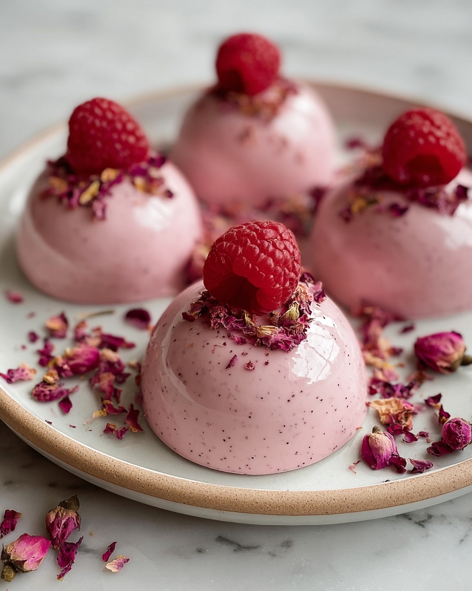 Four small, round, dome-shaped desserts with a smooth, shiny pink surface sit on a white marbled texture inside a white plate. Each dome is topped with two fresh red raspberries and sprinkled with dried rose petals. More dried rose petals are scattered around the plate, adding soft pink, red, and purple colors that contrast with the light pink domes. The close-up view shows the gentle texture of the desserts and the delicate details of the rose petals and raspberries. Photo taken with an iphone --ar 4:5 --v 7