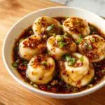 A white bowl filled with around ten round dumplings that have a smooth, glossy surface, some dumplings are a light golden brown while others are off-white. They sit in a reddish-brown sauce with visible oil, chili flakes, and small chopped green onions sprinkled over the dumplings and sauce. A dark wooden spoon rests inside the bowl, lifting one dumpling. The bowl is placed on a wooden board, and in the background, there is a white bowl with chopped green onions on a white marbled surface. Photo taken with an iphone --ar 4:5 --v 7