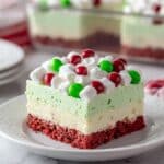 Celebrate the holidays with this festive Christmas Lasagna dessert featuring a vibrant red vanilla wafer crust, creamy white cheesecake layer, and refreshing green peppermint pudding, all topped with fluffy whipped topping, mini marshmallows, and fun Christmas candies. This no-bake layered dessert is perfect for holiday parties and family gatherings.