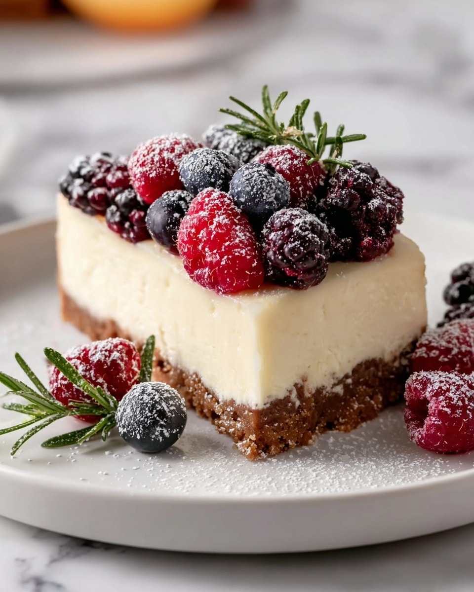 My favorite part is decorating the cheesecake just before serving. I pile on fresh strawberries, blackberries, raspberries, and cherries for that jewel-toned pop of color. Orange slices and rosemary sprigs add a subtle festive flair that smells amazing too. A light dusting of icing sugar on top gives it that wintry snow-kissed look that always impresses.