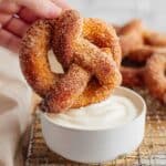Keywords: cinnamon sugar pretzels, soft pretzels, homemade pretzels, cream cheese dip, sweet pretzels, snack recipe