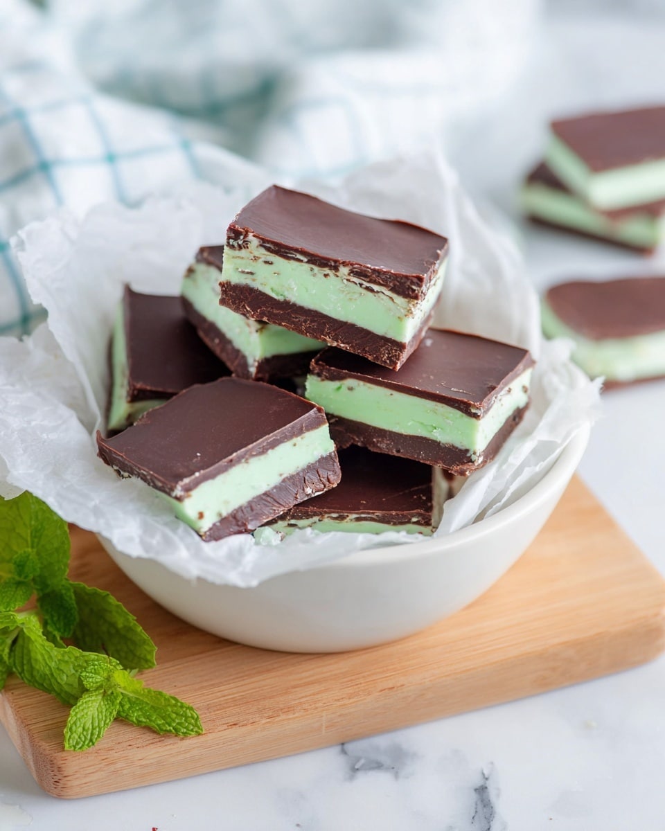 I typically serve these without extra garnishes because they’re so charming on their own. But sometimes, a tiny sprinkle of crushed candy canes on the white mint layer before the final chocolate layer sets adds a festive crunch and extra peppermint pop.