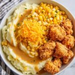 - Assemble the Bowls: In each of four large serving bowls, spoon 1 cup of mashed potatoes as the base, add ½ cup steamed corn, pour over ⅓ cup hot chicken gravy, sprinkle ¼ cup shredded cheddar cheese, and top with 5 crispy chicken nuggets.