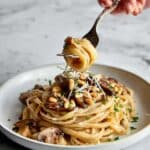 I store any leftover creamy garlic mushroom pasta in an airtight container in the fridge for up to 3 days. The sauce thickens in the fridge, so it’s perfectly safe to reheat with a splash of water or cream to loosen things up again.