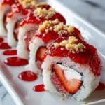 This Creative & Cute Strawberry Shortcake Sushi Roll is a delightful fusion dessert combining the flavors of classic strawberry shortcake with the fun presentation of a sushi roll. Using a soft sponge cake as the ‘rice,’ it’s filled with a luscious cream cheese and whipped cream mixture combined with fresh strawberries and strawberry preserves. Rolled to perfection and optionally drizzled with white chocolate and garnished with mint leaves, this no-bake dessert is perfect for parties or a special treat.