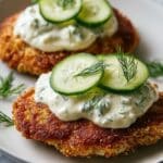 Two golden brown fried patties with a crispy texture are placed side by side on a white plate. Each patty has a topping of thick, white creamy sauce with a slightly chunky texture, garnished with thin, green slices of cucumber and small sprigs of fresh dill. The plate sits on a white marbled surface. photo taken with an iphone --ar 4:5 --v 7