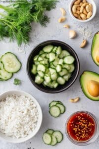While your rice is crisping, get busy with the fresh ingredients. Dice the avocado, thinly slice cucumber, bell pepper, and spring onions, and roughly chop your coriander and dill. If you’re using frozen edamame, thaw them under cold water and pat dry before adding. Prepping everything early means you can toss the salad quickly once your rice is ready.