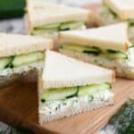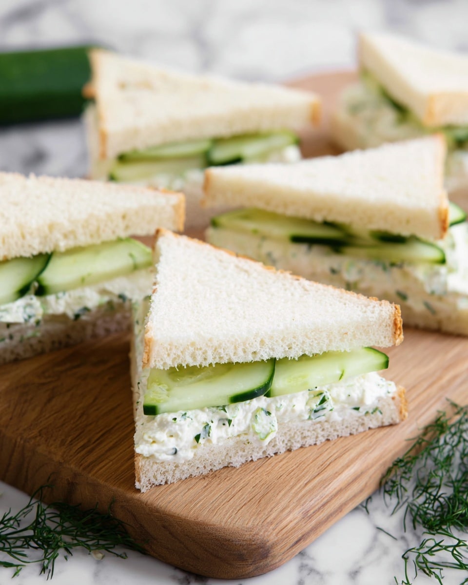If you end up with leftovers (rare, but it happens!), wrap the sandwiches tightly in plastic wrap and store in the fridge. I recommend eating them within 24 hours because cucumbers can make the bread soggy if stored too long, but if you want to avoid that, store the filling separately and assemble just before serving.