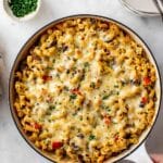 - Make sure not to overcook the pasta in the skillet as it will continue cooking in the oven.