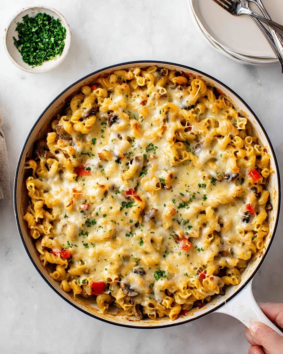 - Assemble the Casserole: Preheat your oven to 350°F (175°C). Transfer the beef, vegetable, and pasta mixture into a baking dish. Layer the provolone cheese slices evenly over the top.
