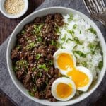 Keywords: ground beef bulgogi, Korean beef recipe, easy bulgogi, bulgogi sauce, quick Korean dinner, soft boiled egg topping, stovetop bulgogi