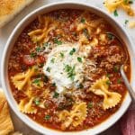 This Easy Lasagna Soup recipe combines the classic flavors of traditional lasagna in a quick and comforting soup form. Featuring a hearty mix of ground beef, tomatoes, Italian seasonings, and bowtie pasta, it’s topped with creamy ricotta, melted mozzarella, parmesan, and fresh parsley for a satisfying one-pot meal perfect for chilly days or easy dinners.