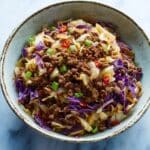 Keywords: Egg Roll in a Bowl, low carb, quick dinner, ground beef recipe, cabbage recipe, Asian stir fry, healthy dinner, gluten free, one pan meal