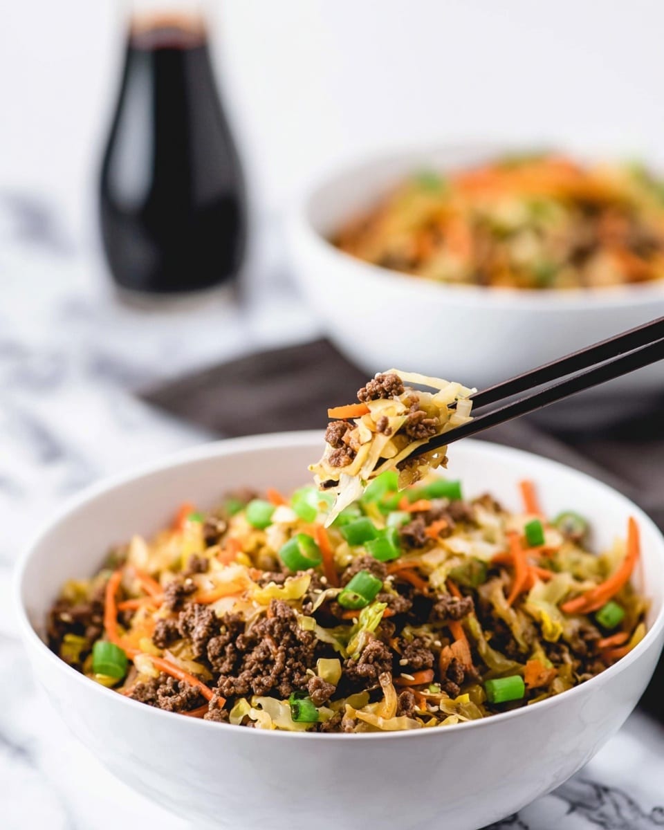 This Egg Roll in a Bowl recipe offers all the delicious flavors of a classic egg roll without the hassle of rolling or frying. Ground beef combined with crisp coleslaw mix, shredded carrots, and savory seasonings come together in a quick and easy skillet meal that’s perfect for busy weeknights or meal prep.