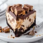 Keywords: Reese’s cheesecake, peanut butter cheesecake, brownie crust cheesecake, chocolate ganache topping, holiday cheesecake dessert