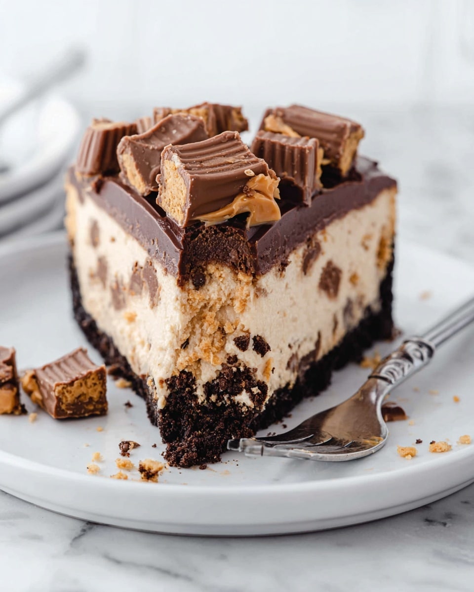 Once, for a holiday party, I served slices on a wooden board decorated with whole peanut butter cups scattered around and little festive sprigs of rosemary for that wintry vibe. You can also build mini individual cheesecakes in jars topped with ganache and peanut butter cups for easy, no-fuss servings that guests loved.