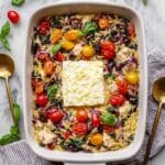 You want the orzo to be tender with a slight bite, not mushy. The bake should have absorbed most of the liquid and have a creamy texture. Check by tasting at around 40 minutes—if it’s too firm, give it a few more minutes, keeping an eye on the top so it doesn’t burn.