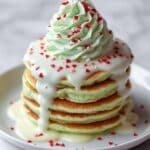 Celebrate the holiday season with these festive Grinch Green Pancakes topped with a luscious cream cheese icing and optional green whipped cream. These fluffy, vibrantly green pancakes are perfectly balanced with a tangy and sweet cream cheese glaze, making breakfast both fun and delicious for kids and adults alike.