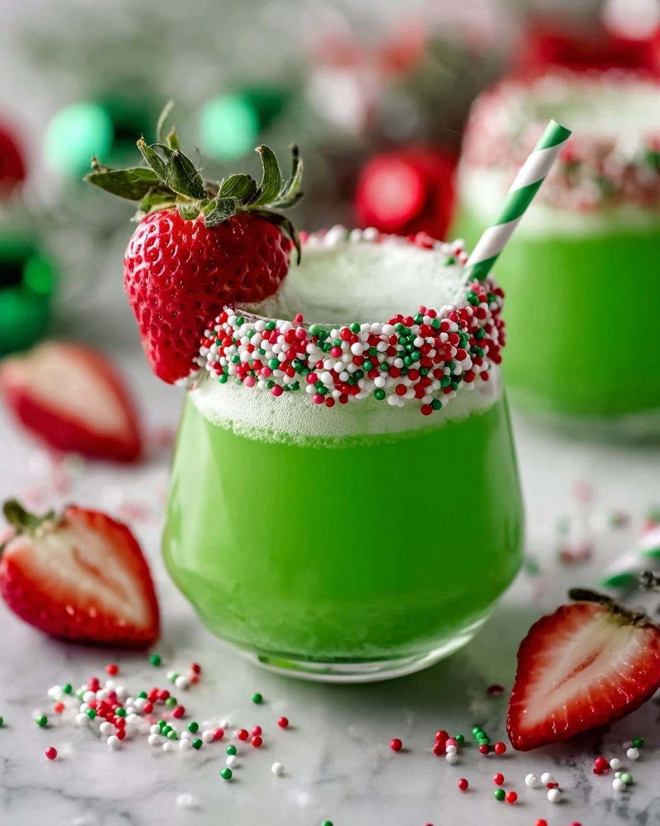 This festive Grinch Punch is a fun, refreshing party drink that’s perfect for holiday gatherings. Combining the tangy sweetness of green Hawaiian punch with the fizzy zest of Sprite and the creamy tang of lime sherbet, this punch is a crowd-pleaser. The addition of heart-shaped strawberries adds a charming and colorful touch, making it an eye-catching centerpiece for any celebration.
