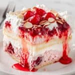 This cake is really meant to be served chilled and doesn’t need reheating. But if you want softer slices after fridge storage, let it sit at room temperature for 15-20 minutes before serving to soften the Cool Whip and pudding layers nicely.