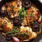 Brush the chicken skin with olive oil, then sprinkle with more thyme, sage, salt, and pepper for a beautiful herb crust. Toss shallot halves, smashed garlic, and cremini mushrooms around the chicken in an oven-safe skillet. Don’t forget a drizzle of olive oil over the mushrooms to help them roast nicely—season those too! Roast everything together for about 20 minutes, or until the chicken hits an internal temperature of 165°F. You’ll start smelling those amazing herb and mushroom aromas while it cooks, and the chicken skin should get nice and crispy.