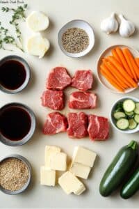 - Prepare the Vegetables: While the steak marinates, slice the carrots thinly on a bias, halve the zucchinis lengthwise and cut into half moons, and slice the mushrooms. Set aside.