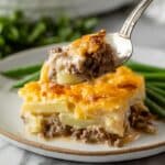 5. Repeat Layers: Add another layer of potatoes, the remaining beef mixture, the rest of the soup mixture, and finish with the remaining shredded cheese on top.