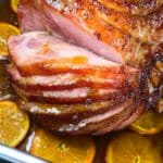 - Serve: Carve the ham along the spiral cuts and serve warm, garnished with the roasted orange slices around the platter for an attractive presentation.