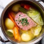 Everything here works together to create that classic corned beef dinner you remember from family gatherings. Shopping for fresh cabbage and getting good quality corned beef brisket will really elevate your meal, and the potables and carrots add just the right amount of sweetness and texture.