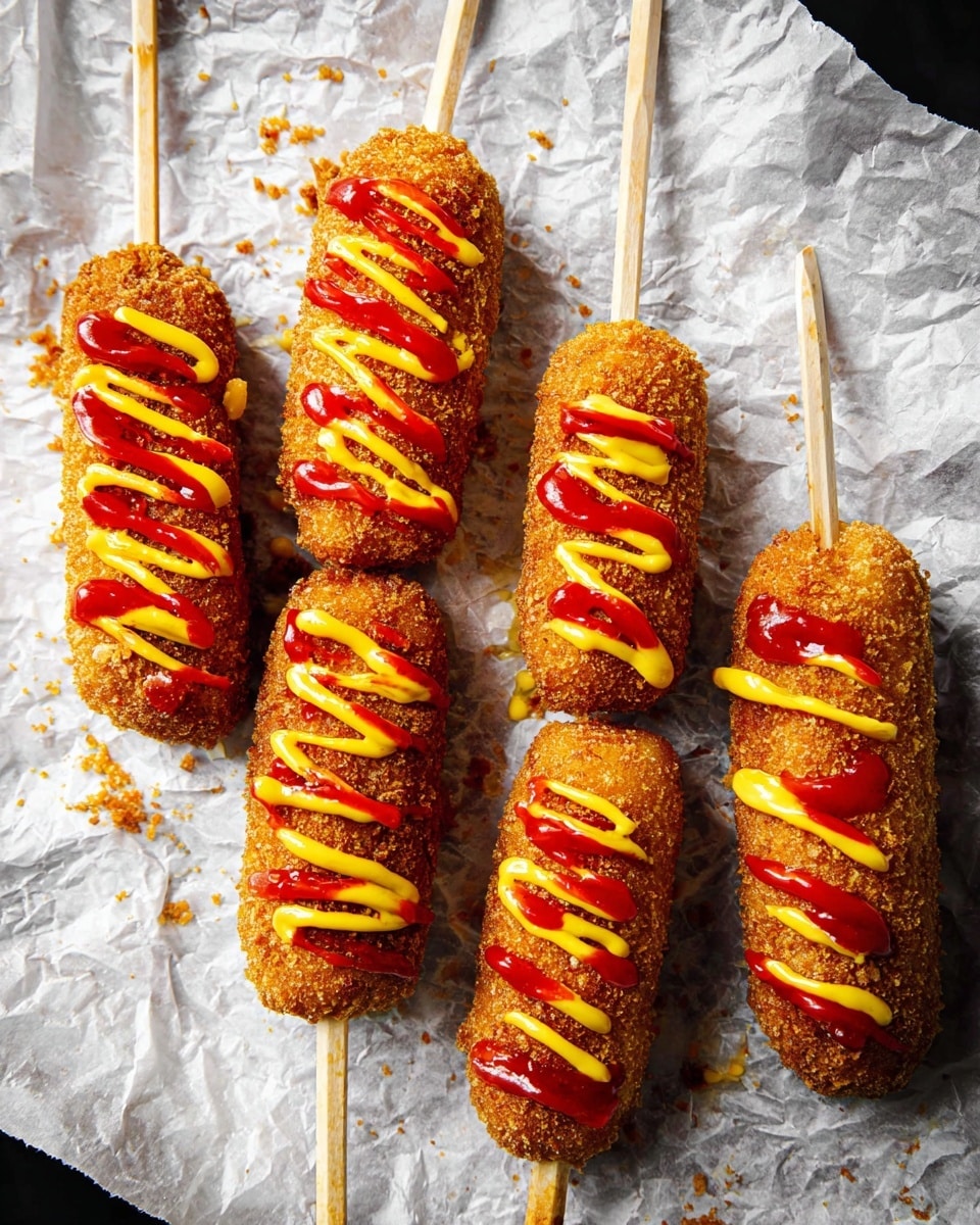 My go-to garnishes are a simple dusting of sugar and a swipe of creamy mayo or nacho cheese right on the crispy corn dog shell. It adds that sweet and savory combo that just melts in your mouth. I sometimes toss chopped scallions or drizzle a bit of spicy sriracha mayo for a flavor pop when entertaining friends.