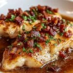 Once the chicken is nearly cooked, crumble the crispy bacon on top or place whole strips over each piece. Let everything cook together for another minute or two so the bacon warms up and infuses the chicken with more smoky goodness. You’ll want to watch the sauce to keep it from burning—add a splash of water if needed to loosen it up.