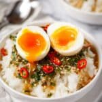 - Serve: Remove the eggs from the marinade and slice in half or quarters. Serve as a topping for rice bowls, ramen, salads, or enjoy as a flavorful snack. Optionally garnish with additional sesame seeds or green onions.