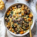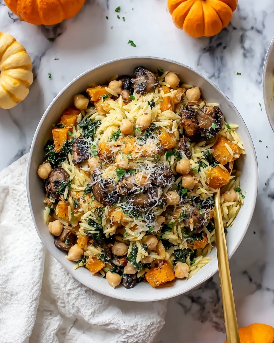 This One Pot Fall Vegetable Orzo and Chickpeas recipe is a comforting and hearty dish perfect for autumn. It combines tender butternut squash, savory mushrooms, vibrant kale, and protein-rich chickpeas with delicate orzo pasta, all cooked together in a flavorful vegetable broth. Finished with a sprinkle of Parmesan cheese and fresh herbs, this meal is quick to prepare, nutritious, and packed with seasonal flavors.
