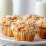 Keywords: Peach cobbler muffins, peach muffins, streusel topping, breakfast muffins, fruit muffins, homemade muffins