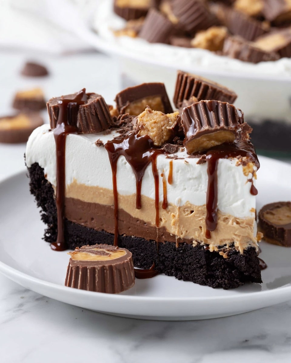 This dessert is best served cold, so rather than reheating, I just let leftovers sit at room temperature for 10-15 minutes to soften up a bit before enjoying. It keeps the creamy texture intact and you get all those lovely peanut butter and chocolate flavors without losing any of the refreshing chill.