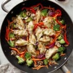 If you want to freeze leftovers, separate the potstickers from the veggies and sauce if possible. I’ve found that freezing the potstickers alone keeps their texture intact better. Just thaw overnight in the fridge before reheating.