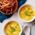 This classic Egg Drop Soup recipe delivers a comforting, silky broth made with chicken stock and delicate strands of egg. Enhanced with a touch of sesame oil, turmeric for color, and seasoned with salt, white pepper, and MSG, it’s a quick and easy soup perfect for a light meal or appetizer. Cornstarch provides a smooth, slightly thickened texture, while chopped scallions add freshness and a mild onion flavor.