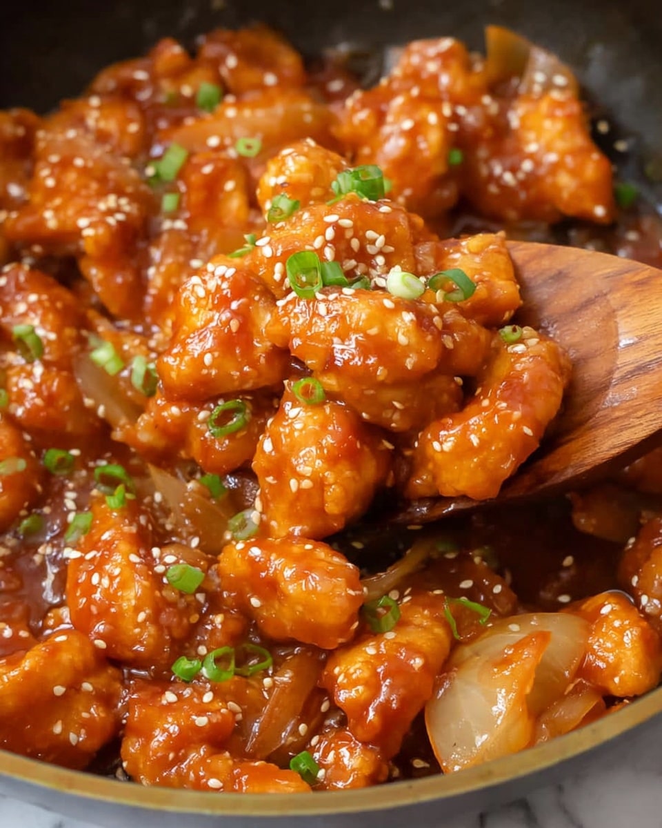 4. Combine and Thicken: Pour the sauce mixture into the skillet with the cooked garlic and onions. Stir continuously until the sauce begins to thicken, about 2-3 minutes. Once thickened to a glossy consistency, return the fried chicken pieces to the skillet, tossing them thoroughly to coat each piece evenly with the sauce.