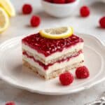 - Serve: Before serving, spread the remaining raspberry jam in an even layer on top of the tiramisu. Decorate with fresh raspberries and lemon slices for a beautiful presentation.