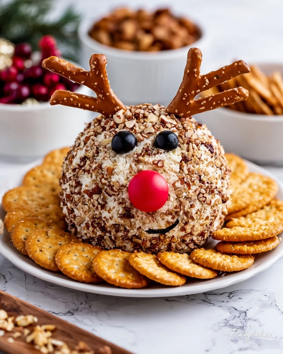 Keywords: Christmas appetizer, cheese ball, holiday snack, festive appetizer, reindeer cheese ball, cream cheese appetizer, party food