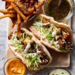For a party, I love laying out all the elements—warm pitas, roasted cauliflower, zhug, garlic tahini, pickled onions, and lettuce—so everyone can assemble their own. It turns dinner into a fun interactive experience! You can also serve it open-faced on flatbreads for a more rustic look or even turn it into lettuce wraps if you’re avoiding bread.