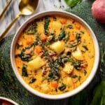 I recommend red or yellow potatoes because they hold their shape during cooking and add a creamy texture without falling apart. Russet potatoes tend to get too mushy here.
