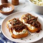 Now, spoon that luscious shredded beef onto slices of fresh white or sourdough bread, and generously ladle warm gravy over the top. The bread soaks up all those savory juices, making every bite indescribably good. Serve right away—ideally with a side of creamy mashed potatoes to soak up any extra beefy goodness.