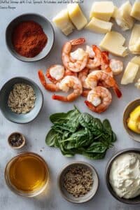 Start by prepping your shrimp: rinse, pat dry, then carefully butterfly each one so it’s ready to hold the filling. This part takes a little patience — I like to use a sharp paring knife and gently slice down the back without cutting all the way through. Next, mix all your filling ingredients — crab, chopped spinach and artichokes, mayo, cheeses, breadcrumbs, seasonings, and lemon — in a bowl until it’s creamy and well combined. Pro tip: If your spinach or artichokes are watery, squeeze them gently in a clean towel to keep the filling from getting soggy.