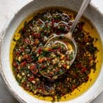 Pour the olive oil into a medium bowl and stir in the shallots, grated garlic, and red chili flakes. I like to let this sit at room temperature for 5-10 minutes so the flavors start to marry—that way the garlic softens and the chili infuses nicely without overheating or burning.
